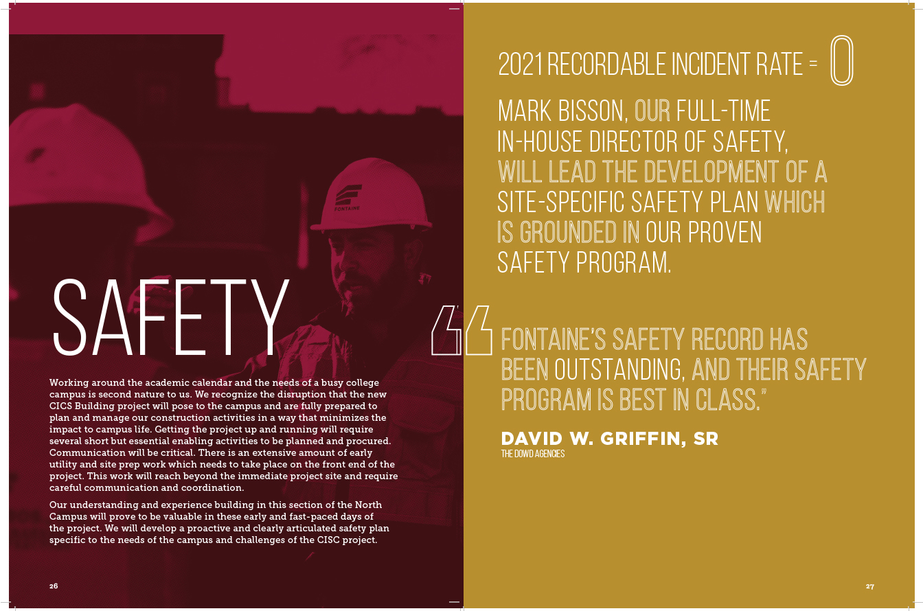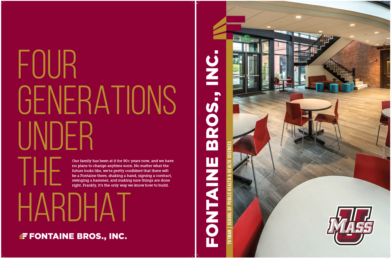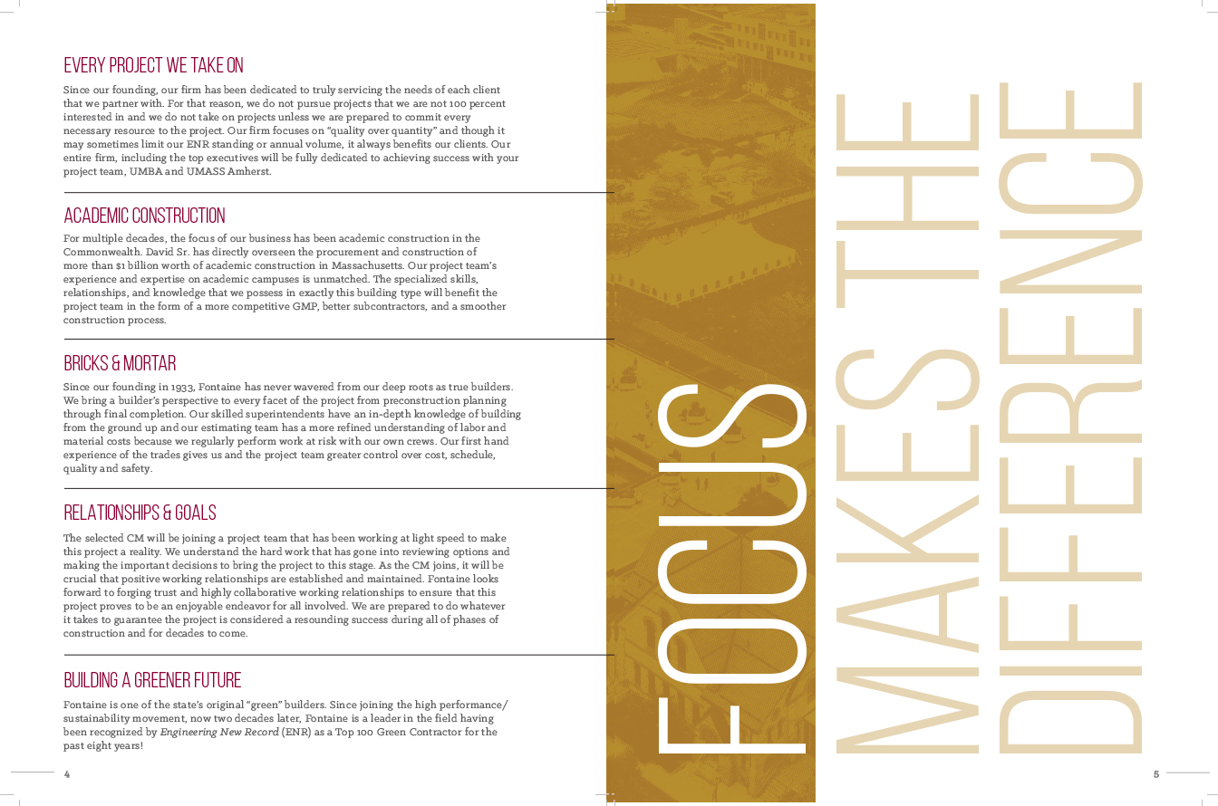 Fontaine Bros. is a high-performance sustainable construction contractor in Massachusetts. The quality of their buildings is previewed in the quality of their proposals. Large 11″ x 17″ brochures catch their clients’ attention. The company’s history and portfolio is presented in editorial style, creating surprise and insight on each spread. The graphics are created in Photoshop and Illustrator and the design assembled in InDesign to generate high-resolution files for a printer. This visual template is customized for each new potential client, maintaining brand guidelines while allowing for new content.