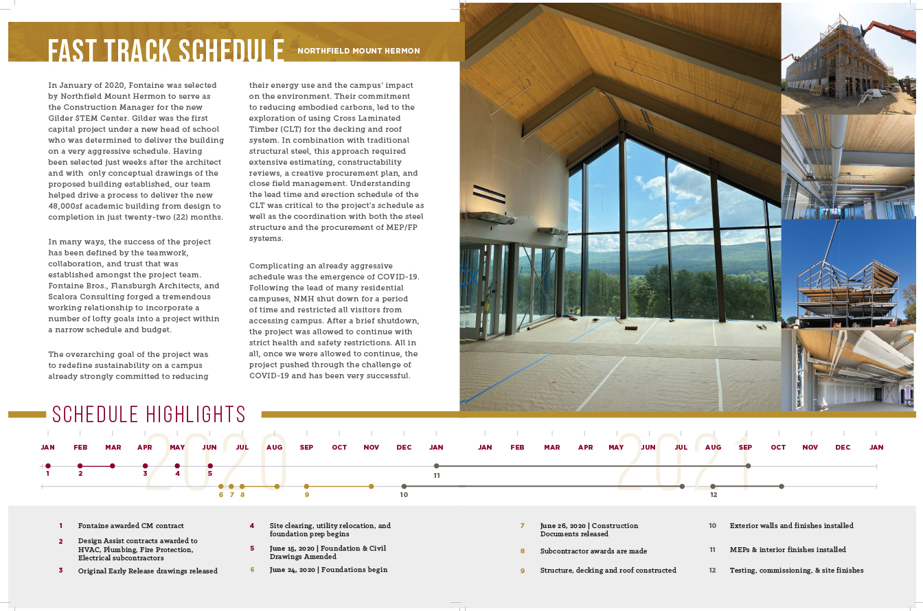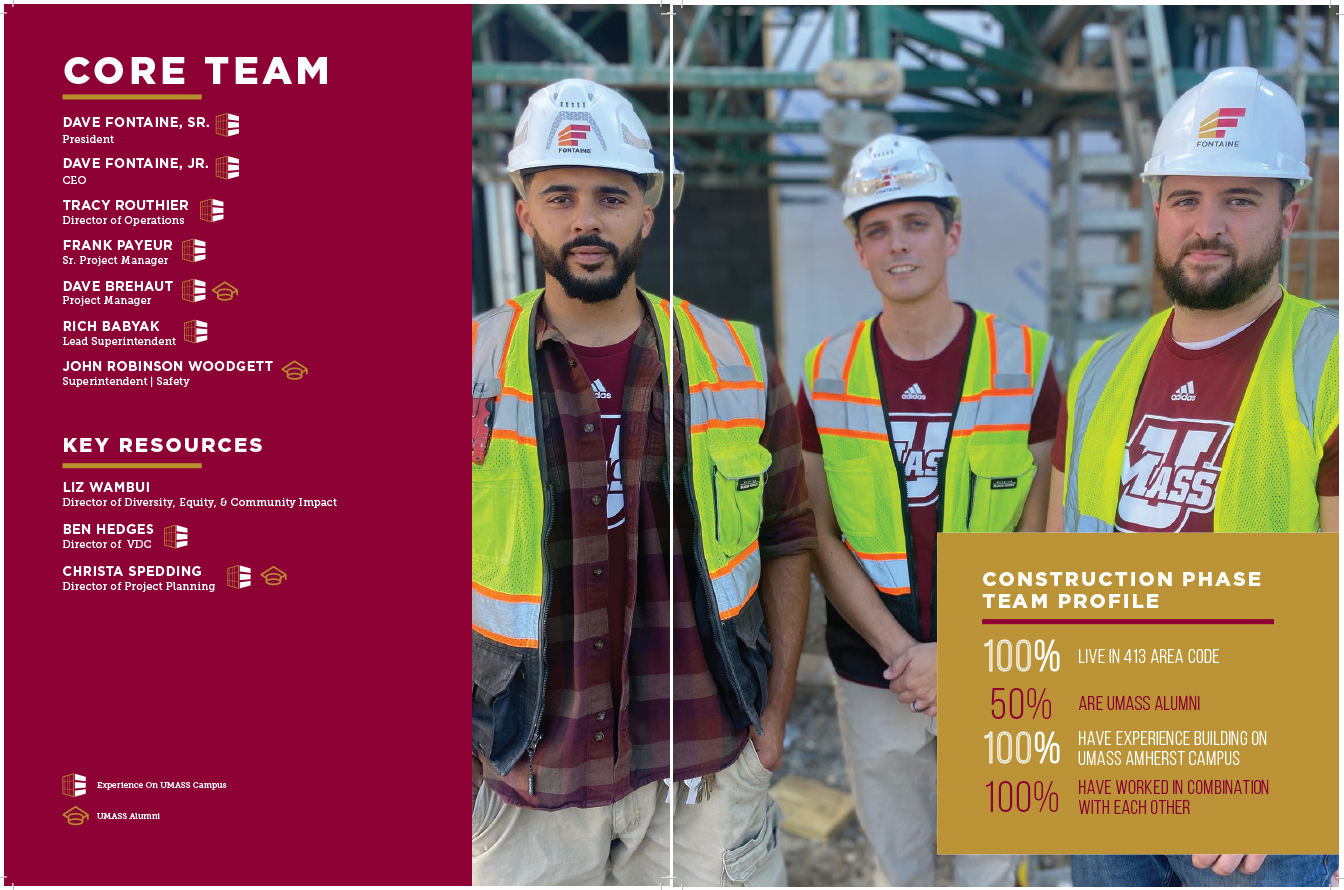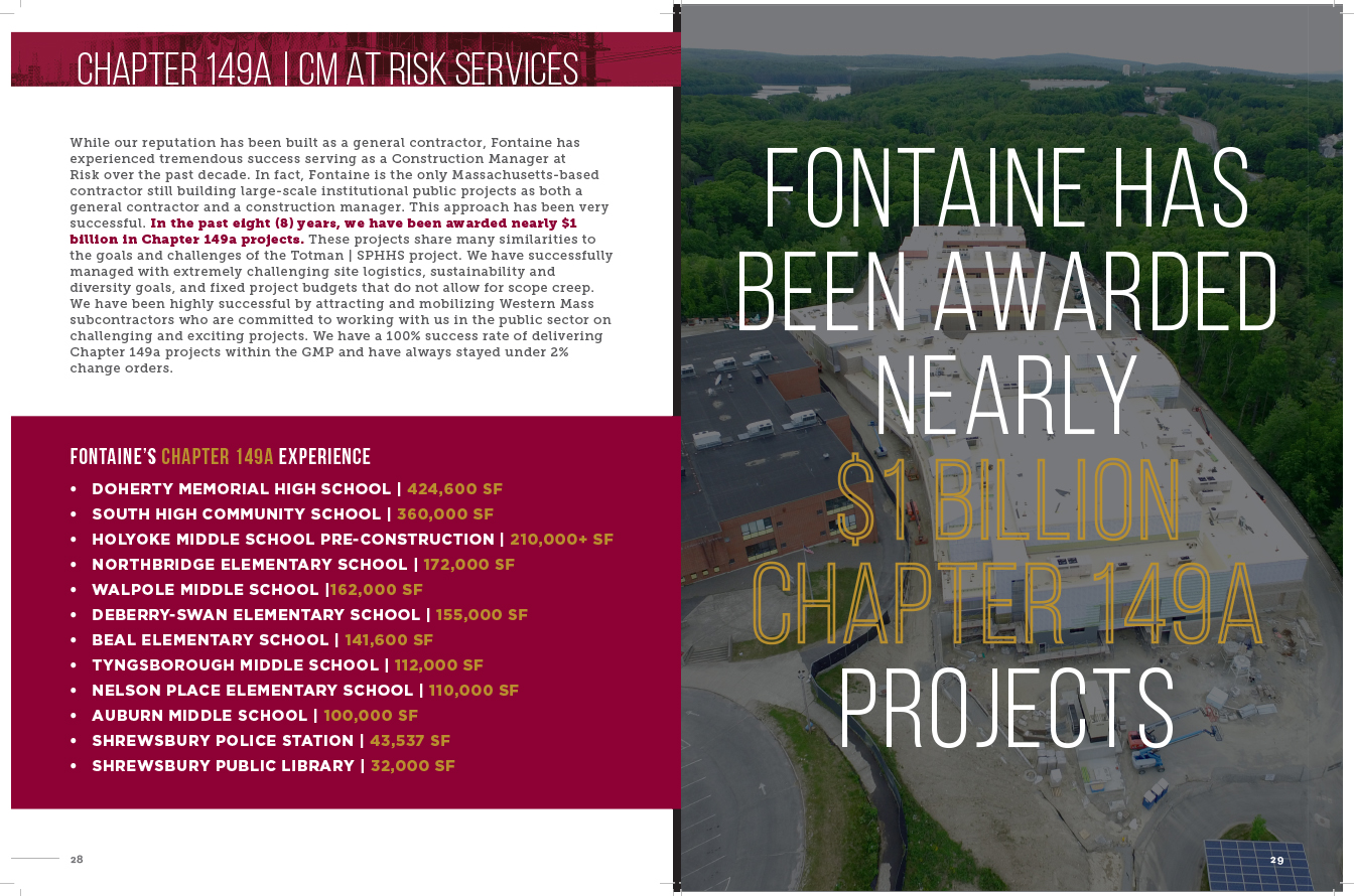 Fontaine Bros. is a high-performance sustainable construction contractor in Massachusetts. The quality of their buildings is previewed in the quality of their proposals. Large 11″ x 17″ brochures catch their clients’ attention. The company’s history and portfolio is presented in editorial style, creating surprise and insight on each spread. The graphics are created in Photoshop and Illustrator and the design assembled in InDesign to generate high-resolution files for a printer. This visual template is customized for each new potential client, maintaining brand guidelines while allowing for new content.